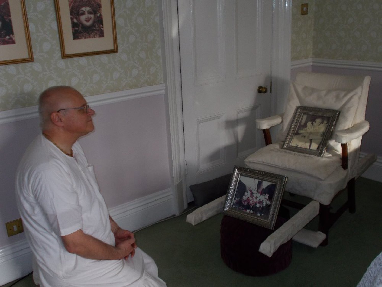 Caught by intensity of that Manor atmosphere, I retreated to the temple room which was filled with praying devotees. Srila Prabhupada was upstairs in His rooms, obviously in criticial condition. Servants were moving swiftly around, asking for various ingredients. The rest of devotees was intensely chanting japa.
